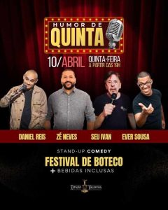 Durante este mês de abril, todas as quintas-feiras, a partir das 19h, o restaurante Estação Valentina, do Unimart Shopping Campinas, realiza o Humor de Quinta, festival de boteco que garante a combinação de muita comédia, com open food e bar, com preços que variam entre R$ 79,90 e R$ 99,90, incluíndo show e comida.